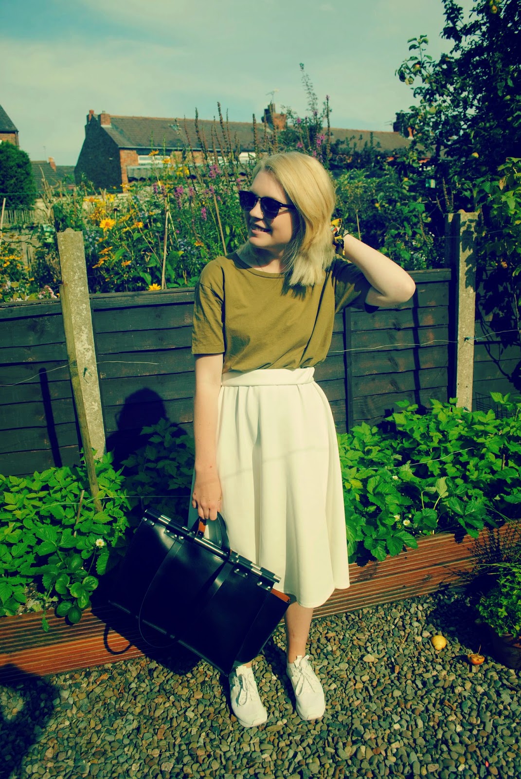 Khaki Tee - Zara | Midi Skirt - Boohoo | Trainers - Zara | Doctor's Bag - Zara | Sunglasses - Primark